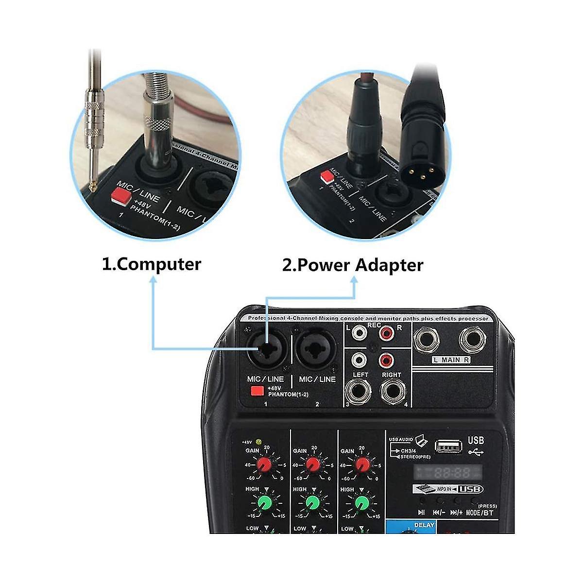 1. The mixer is equipped with, input gain and high and low pitch adjustment. The built-in 48V phantom power supply is suitable for direct power supply of condenser microphone, high-definition headset output port, MP3 player, Bluetooth receiver, and connected PC sound card. 2. The mixer is small and light, and can be directly connected to the USB port of the PC for power supply. No additional power is required. It can be connected to the computer for power supply through USB, saving the of using an external adapter 3. You can also use a mobile power supply or USB AC/DC adapter to power it. 4. This mixer is a multi-purpose 4-channel mixer with sound card, which can the 's needs music production, online live , karaoke cover, etc 5. Mini portable, easy to operate Model: A4 Totai Harmonic Distortion:less than 0.1% Frequency Response:20Hz~20KHz/0.5dB S : -80dB MAX Outputs:4V/MAX Input/Output impedance: MIC:2.4Kohm :11Kohm Stereo:100Kohm Parametric EQ: HI:12KHz15dB LOW:80Hz/15dB Product size: 180 150mm Function: 1,2 channel signal input channel stereo input 2,One main channel output,one AUX output and feed back 3, channel for recording output and monitor 4,Low-noise,high-precision microphone preamplifier with perfect sound 5,Balanced XLR microphone input and balanced inputs,3-band channel EQ 6,48V DC phantom power will responsible for connect with condenser mic,and power supply for input port 7,Port for eqrphone monitor 8,Precision logarithmic double 10 LED level display 9,MP3 module,USB interface,and display 10,Built-in switching power supply is flexible(AC100-240V AC),low power consumption Plug Type :EU Plug,it appliesto Indonesia, , , , and so on. Colour:black Material:ABS Package Contents: 1 x 1 x USB power cord 1 cord plug 1 x English manual Only the above package content, other are not included. Note: Light reflection and different displays may cause the color of the item in the a little different from the real thing. The measurement allowed error is +/- 1-3cm.