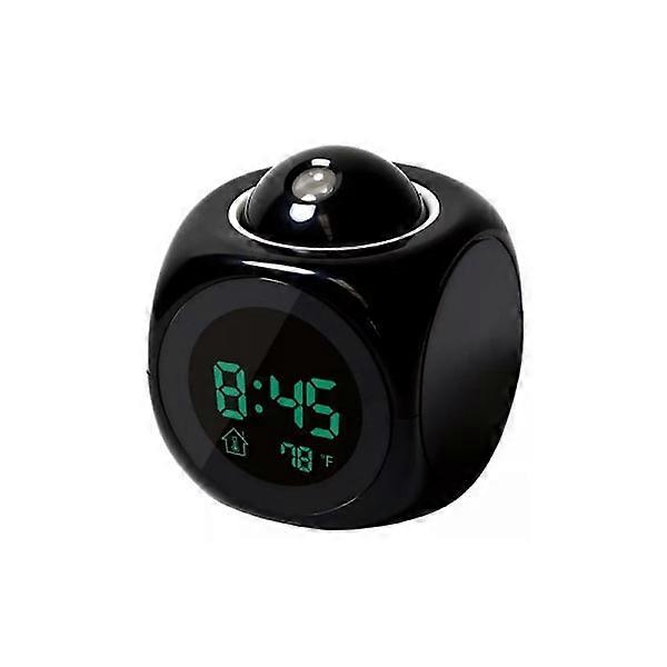Digital Alarm Clock with Projector Features a screen that displays time, temperature, humidity and projects the current time onto any wall or ceiling. LCD time and temperature display with green backlight. Alarm function with a 10-minute snooze option. Voice call function: reports the current time in English. Two types of CHIME report function: CHIME1: every hour; CHIME2: only from 7:00 to 21:00. Five types of alarm sounds can be selected. Two modes available: 12-hour or 24-hour format. Adjustable 90-degree projection angle. Compact size. Projection color: red. Projection distance: 2m-6m. Powered by three AAA batteries (not included) or USB charger (included). Size: 8cm x 8cm x 10cm. Package contents: one alarm clock | one USB cable | user manual. Colors: Black