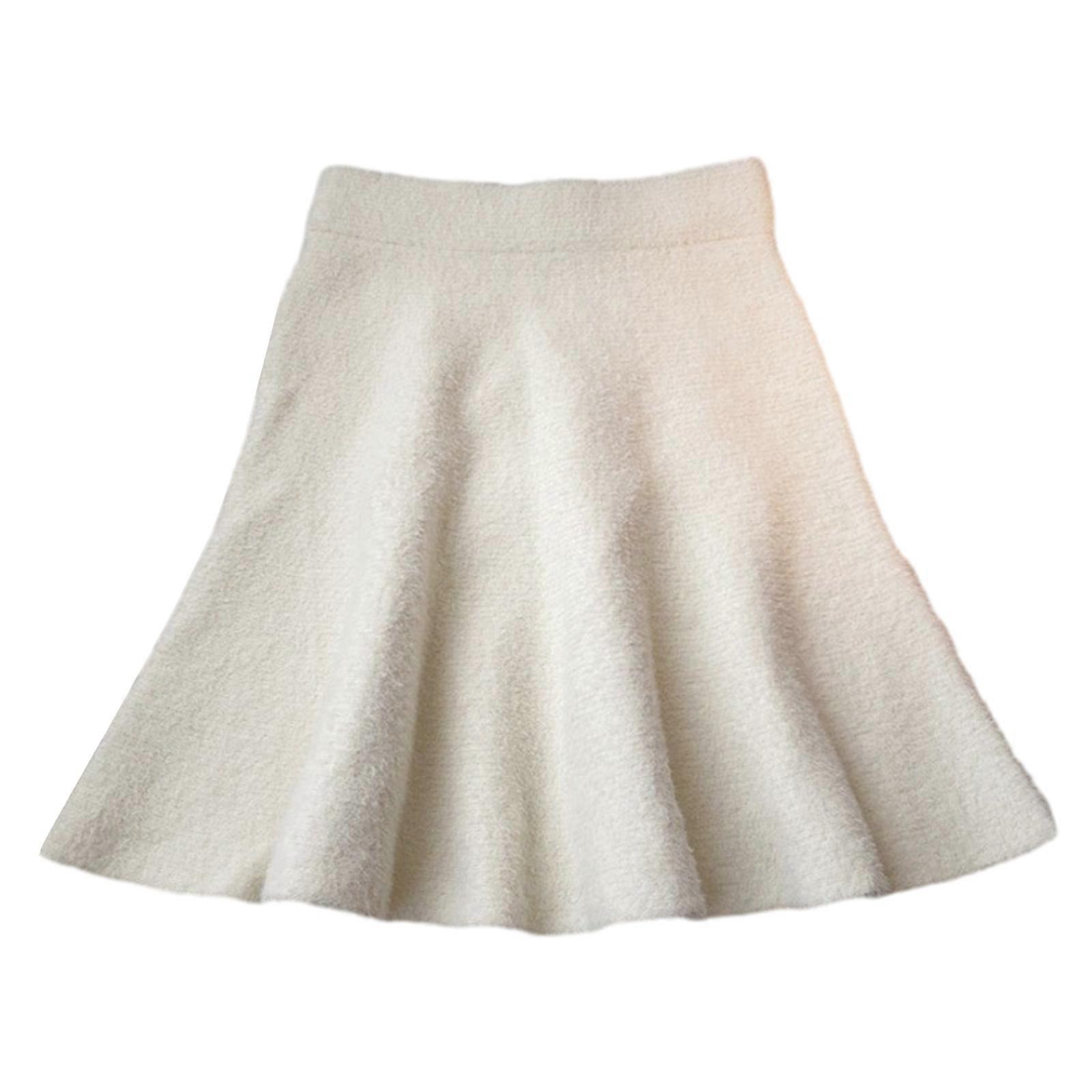 Women Fall Winter Elastic High Waist Imitated Mini Skirt Solid Color Furry Pleated Flared A-Line Short Skirts White