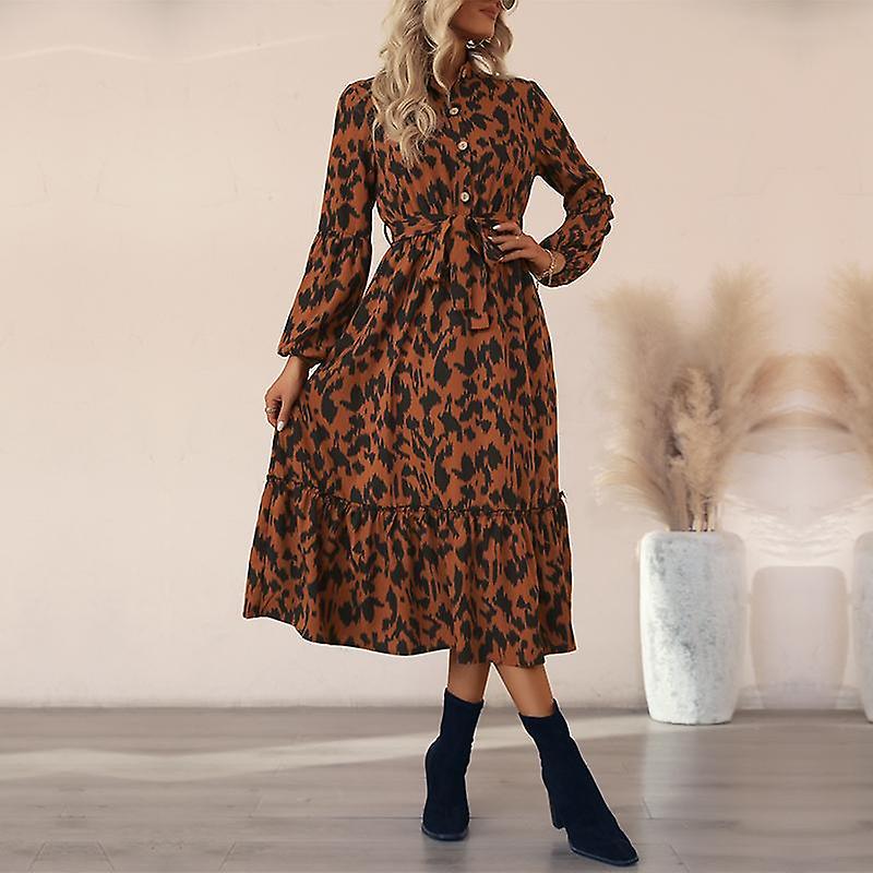 Women's V Neck Long Sleeve Leopard Medium Long Single Breasted Long Dress Spring Autumn
