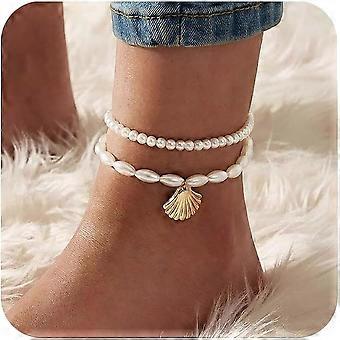 Bohemian pearl anklets for women: layered beaded anklets, shell pendant bracelet, elastic foot chain, shell anklets for women, fashion jewelry.