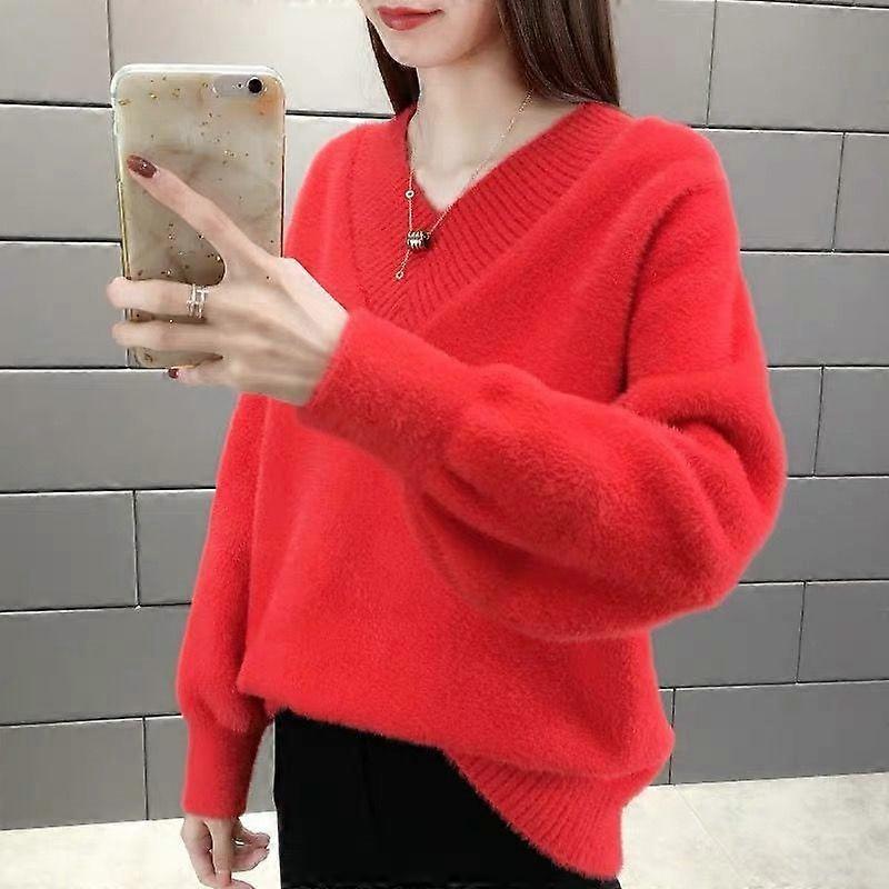 Autumn V-neck Mink Velvet Sweater Women's Pullover Sweater Loose Female Thick Knit Sweater