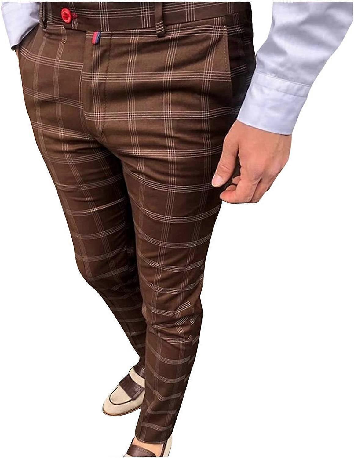 Men's Casual Plaid Dress Pants Stretch Flat-Front Suit Pant Slim Fit Ankle Length Pencil S-2XL