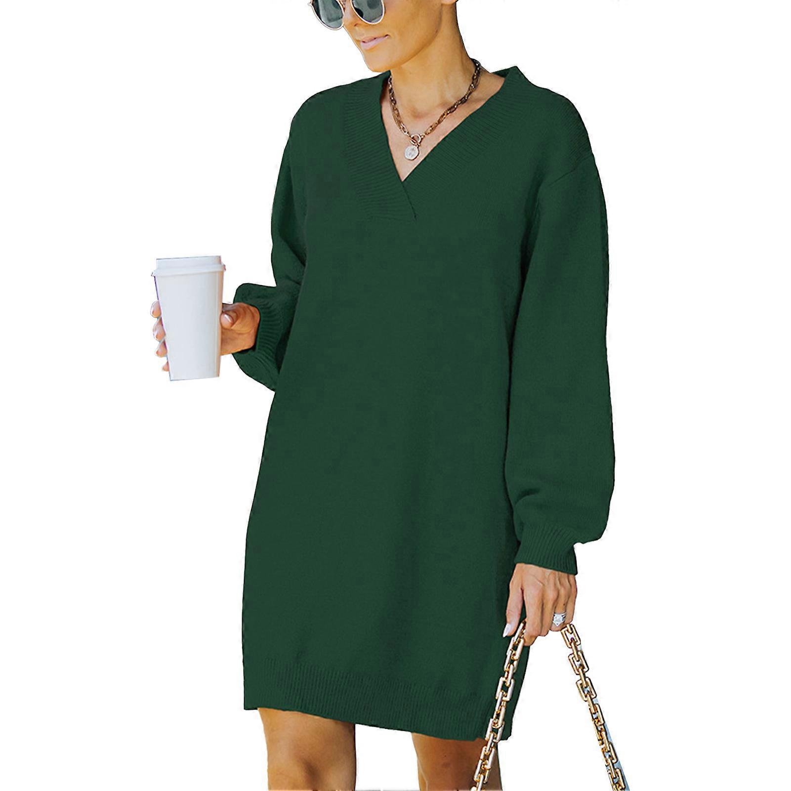 Dress V Neck Long Sleeve Pullover Pure Color Casual Comfortable Knit Dress for Women