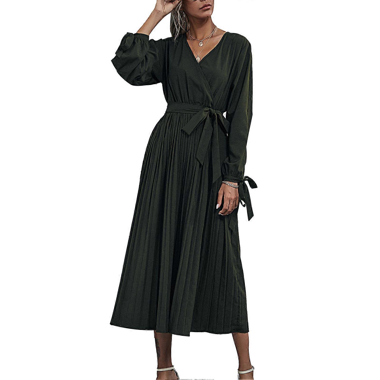 Pure Color Dress Fashion V Neck Hollow Polyester Long Sleeved Dress for Women Fall Winter OD Green S