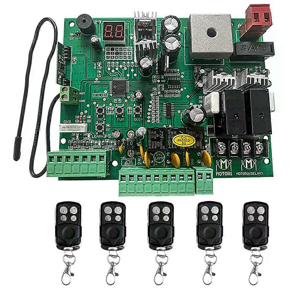Universal Type 24V PCB Board For Automatic Double Arms Swing Gate Opener Control Board Panel Smart Control Center System Please note , This PCB control board can only use the remote control in our photo, it cannot be used with other remote controls Features 1. Application: Used for double or single swing gate opener. 2. Speed -adjustable function. 3. Auto closing/opening,opening/closing delay time adjustment. 4. Adjustable Residence sensitivity. 5.Terminals available for loop detector, photocell, push button, keypad, access control equipment 6. Digital LED Menu brings a easy setting, plug and play. 7. Open/Close single leaf or double leaves. 8. Total 60's working time to protect the motors. Technical Parameters: 1.Control panel voltage input: 24VDCAC. Can connect 2PCS 12V 9AH back up battery. Note that the control board purchased separately needs to be used with a transformer, and cannot be directly 100-250V AC. 2.Motor's voltage: 12-24VDC support.The input of the control board is 24V, and the output is 12-24V. 3.Encoder for transmitter: Use our own customized rolling code.(Encrypted code, no copying and non-ing of our products ) 4.Range of application: Suit for our double arms swing gate openers. *The Linear Spiral 24V Straight Brush Arm is supported, but only fully works with our products, and is not covered by the warranty if tested on a non-ours product. Functions and testing: 1. MOTOR 1: Master gate, close first & open last.This terminal connect 1st red wire (counted from your left hand side to right hand side) 2. MOTOR2(DELAY) : Slave gate, open first & close last.This terminal connect 1st blue wire (counted from your left hand side to right hand side). NOTE! If you only have a single gate, the motor only can connect to the Motor 2 Delay terminal. 3. 2 SIDE: It is for connecting to any external device that operates a double gate. 4. COM:It is for connecting to the “ ground ”. 5. 1 SIDE: It is for connecting to any external device that operates the single gate. 6. Swipe Card: It is for connecting to any external devices to open the gate. 7. COM:It is for connecting to the “ ground ” external device. 8. IR: Infrared terminal is for connecting to the safety beam. 9. 12V: The output is for connecting to the photocell sensor, continuous output current